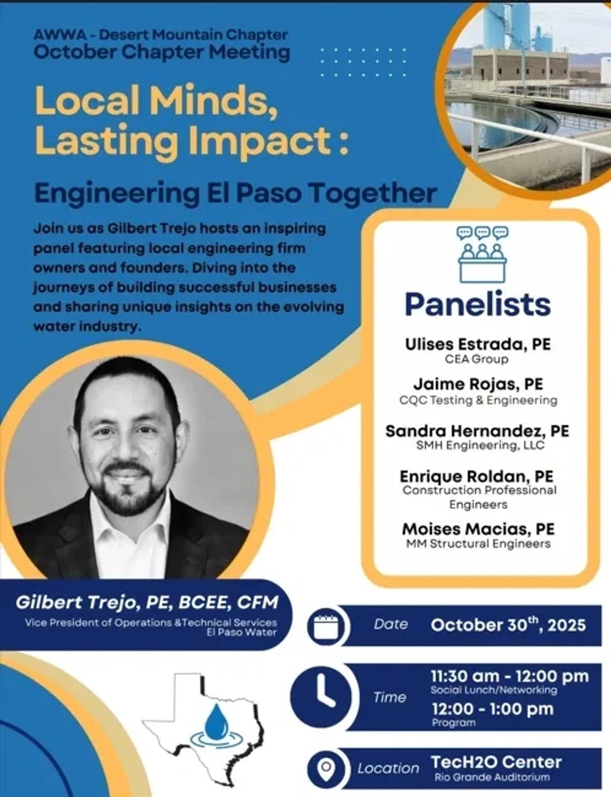 SMH Engineering is proud to announce that our founder, Sandra Moreno-Hernandez, PE, will be a featured panelist at the upcoming AWWA Desert Mountain Chapter Meeting: “Local Minds, Lasting Impact: Engineering El Paso Together.”